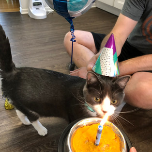 Ollie turned 1-year-old, so naturally as new pet parents Brendan and I threw him a little cat birthday party with decorations, tiny hats, and an Ollie-approved birthday cake.